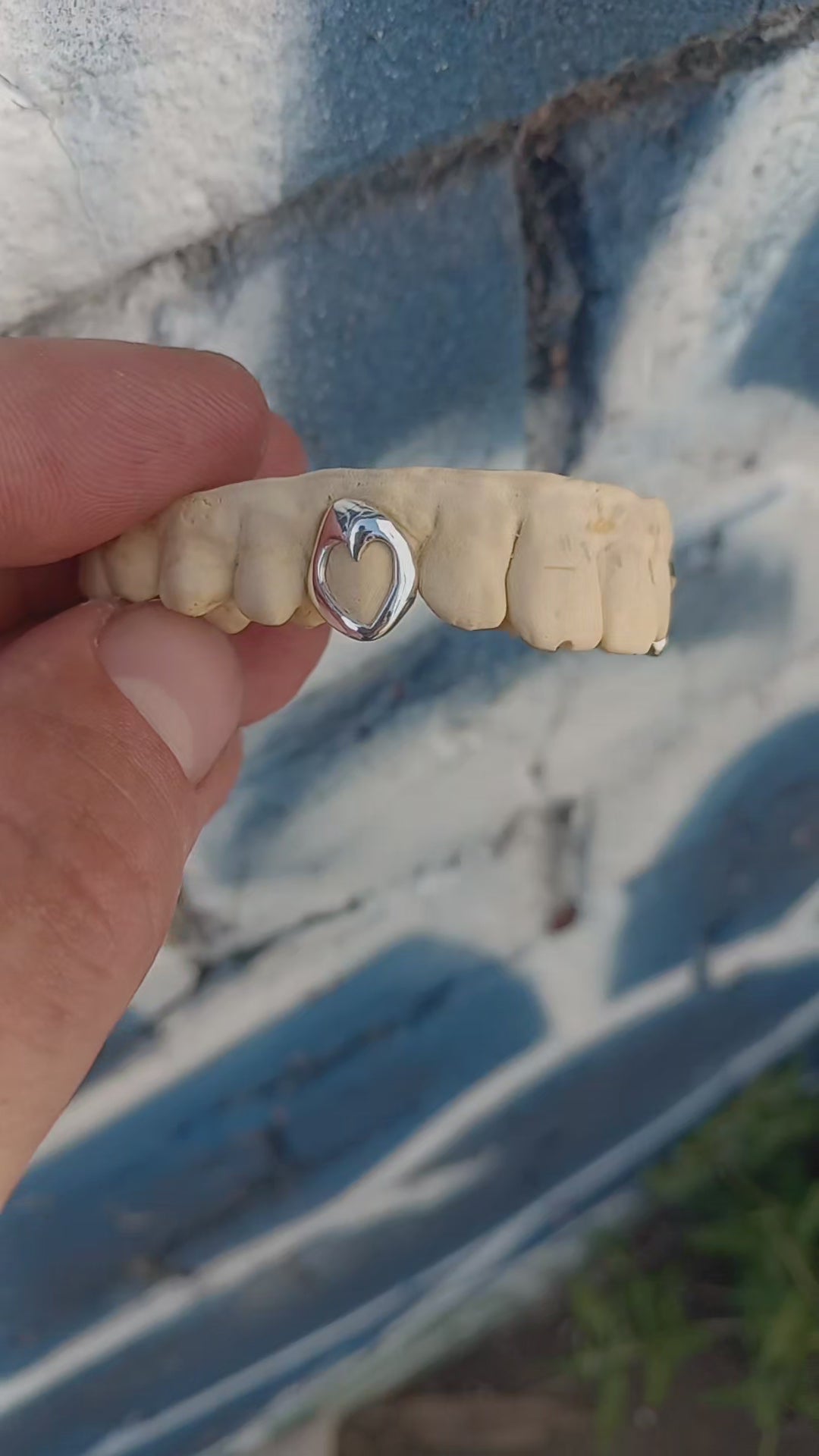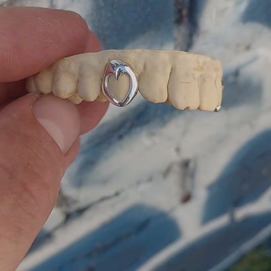 Custom made heart shaped single window grill in 925 sterling silver. Available on your tooth of choice, top or bottom row